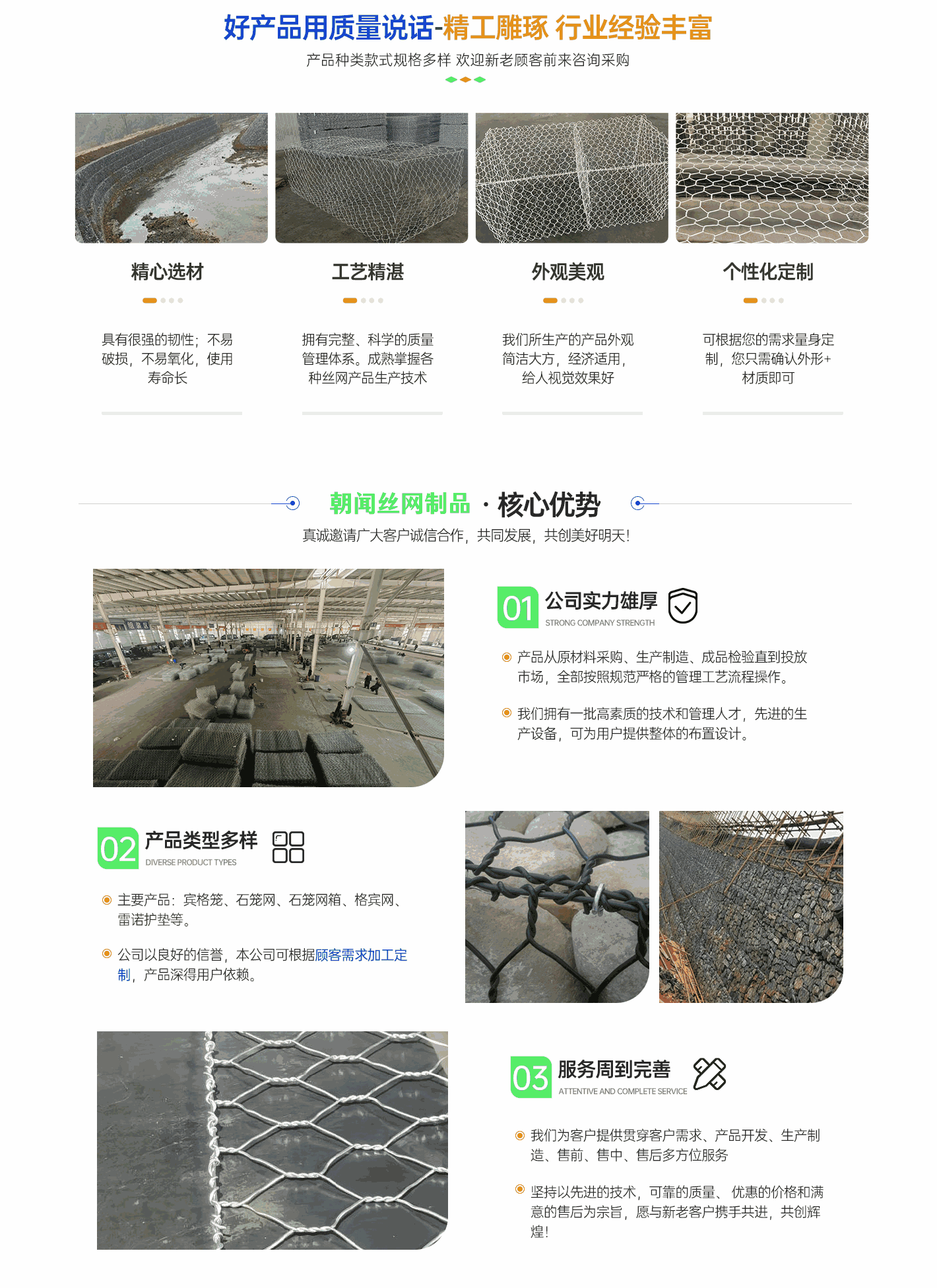 深州市朝聞絲網(wǎng)制品有限公司擁有“中國(guó)絲網(wǎng)之鄉(xiāng)”美譽(yù)的河北省致力于生產(chǎn)銷(xiāo)售格賓網(wǎng),雷諾護(hù)墊,景觀石籠網(wǎng),邊坡防護(hù)網(wǎng),綠濱墊,固濱籠的廠家,規(guī)格多種多樣?! ∥覐S堅(jiān)持技術(shù)創(chuàng)新、科學(xué)管理、誠(chéng)信經(jīng)營(yíng),注重引進(jìn)新型生產(chǎn)技術(shù)設(shè)備,推行標(biāo)準(zhǔn)化生產(chǎn),采用質(zhì)量管理體系,從原材料采購(gòu)、生產(chǎn)管理、產(chǎn)品檢測(cè)等關(guān)鍵環(huán)節(jié)嚴(yán)格把關(guān),確保了產(chǎn)品質(zhì)量,贏得了客戶(hù)的信賴(lài)。我公司秉承“誠(chéng)信、務(wù)實(shí)、高效”的企業(yè)宗旨,真誠(chéng)希望與世界各地客戶(hù)互惠互利,共創(chuàng)美好未來(lái)!多年來(lái)"以誠(chéng)立廠","以質(zhì)興業(yè)"。 憑借過(guò)硬的質(zhì)量、良好的信譽(yù)、優(yōu)質(zhì)的服務(wù)、合理的價(jià)格不斷拓展市場(chǎng),誠(chéng)摯的希望在平等互利,坦誠(chéng)相待的基礎(chǔ)上與國(guó)內(nèi)外客戶(hù)長(zhǎng)期合作!...